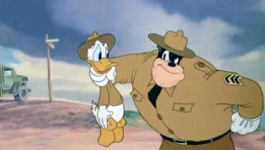 Donald apparaît également dans Donald Gets Drafted, où il découvre avec incrédulité la discipline militaire, dans The Vanishing Private ou encore dans Sky Trooper, où il devient un parachutiste maladroit. L’humour sert ici à divertir tout en préparant le public aux réalités de la mobilisation. La discipline militaire est souvent incarnée par Pat Hibulaire, qui endosse pour l’occasion l’uniforme américain.