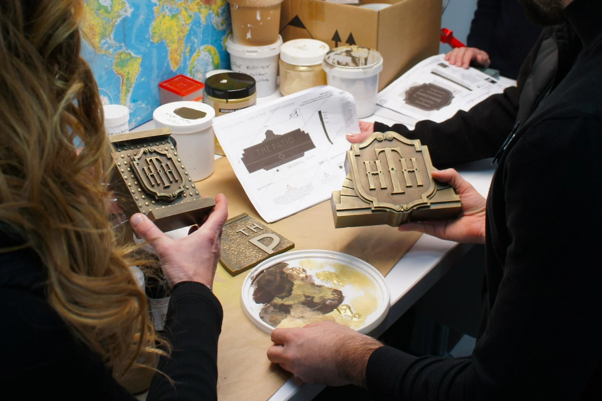 Deux personnes examinent des plaques métalliques et des échantillons de peinture sur une table avec, en arrière-plan, des documents de conception, des récipients de peinture et une carte du monde - peut-être des détails de planification pour Disneyland Paris ou le nouveau Disney Adventure World.