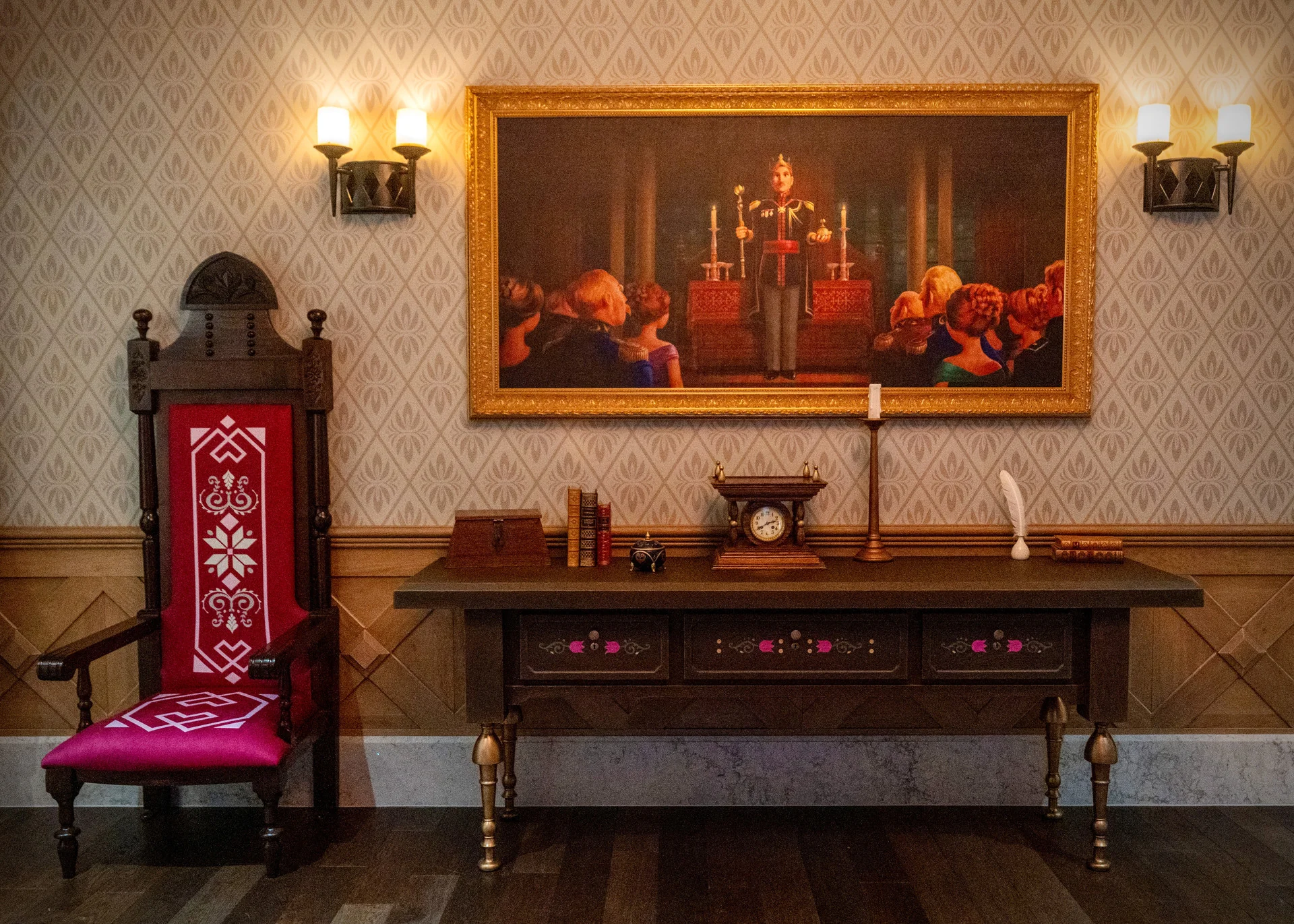 La célèbre rencontre privée Rencontre Royale marque le cœur battant de World of Frozen. Dès l’entrée, l’atmosphère transporte les visiteurs directement dans le château d’Arendelle durant le légendaire Snowflower Festival. Cette expérience intime permet aux fans de rencontrer Elsa et Anna dans un cadre à la fois majestueux et chaleureux. La salle d’attente est particulièrement soignée : elle présente des peintures iconiques inspirées de la chanson ‘For the First Time in Forever’, dont une réinterprétation de ‘The Swing’ de Fragonard, intégrant une touche artistique classique tout en rappelant la magie Disney.