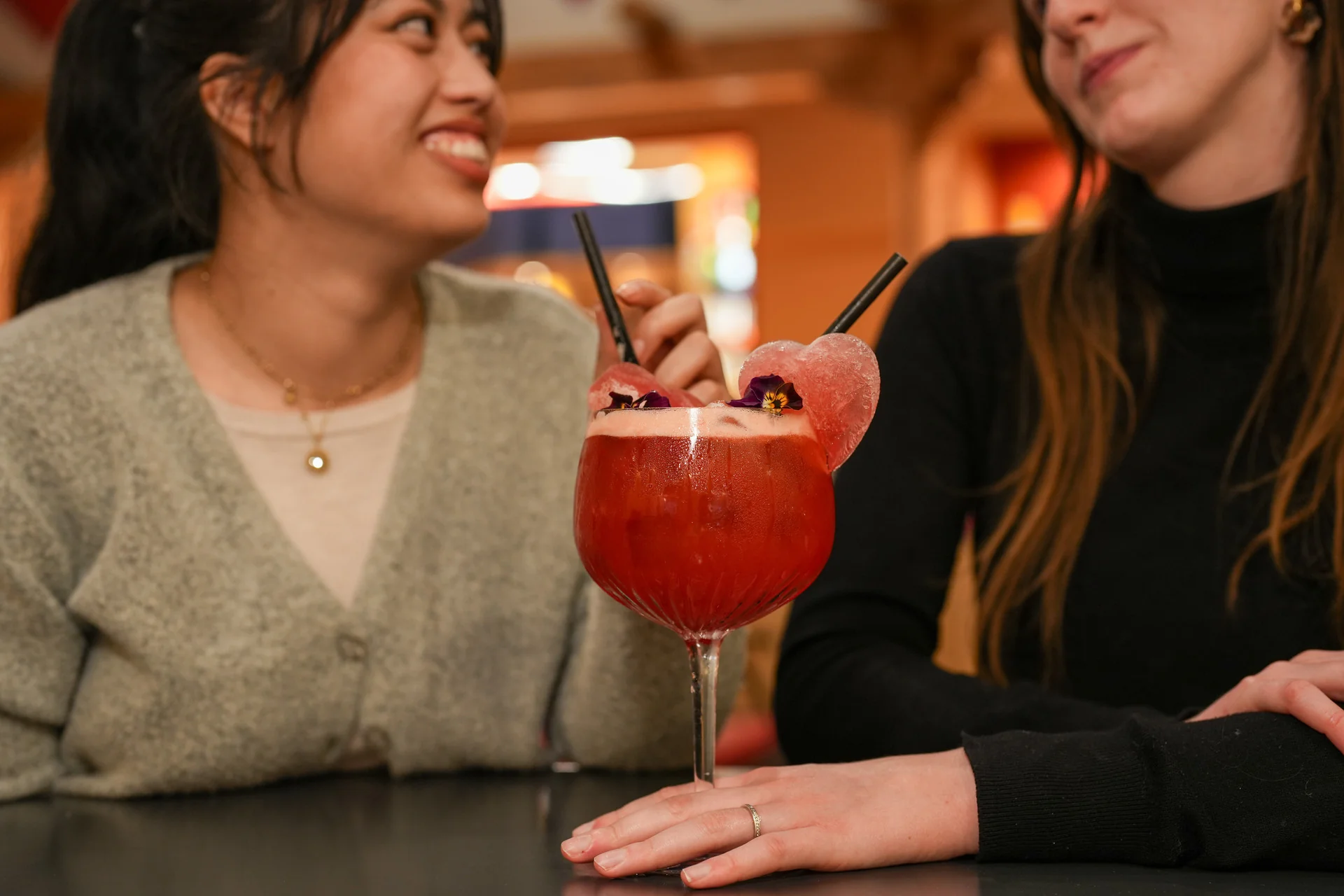 Du 4 au 15 février 2026, Disneyland Paris déploie toute une palette d’initiatives romantiques, parmi lesquelles brillent deux cocktails duo exclusifs, destinés à ravir les papilles et à prolonger l’esprit tendre de la fête. Le premier, Virée à Deux, aussi appelé Heartbreak Motel, est servi au Rio Grande Bar du Disney Hotel Santa Fe. Ce cocktail est un subtil mélange de Smirnoff No. 21 Red Vodka, Malibu, Chambord (liqueur de framboise noire), jus d’ananas, nectar de fruit de la passion et sirop de fraise.