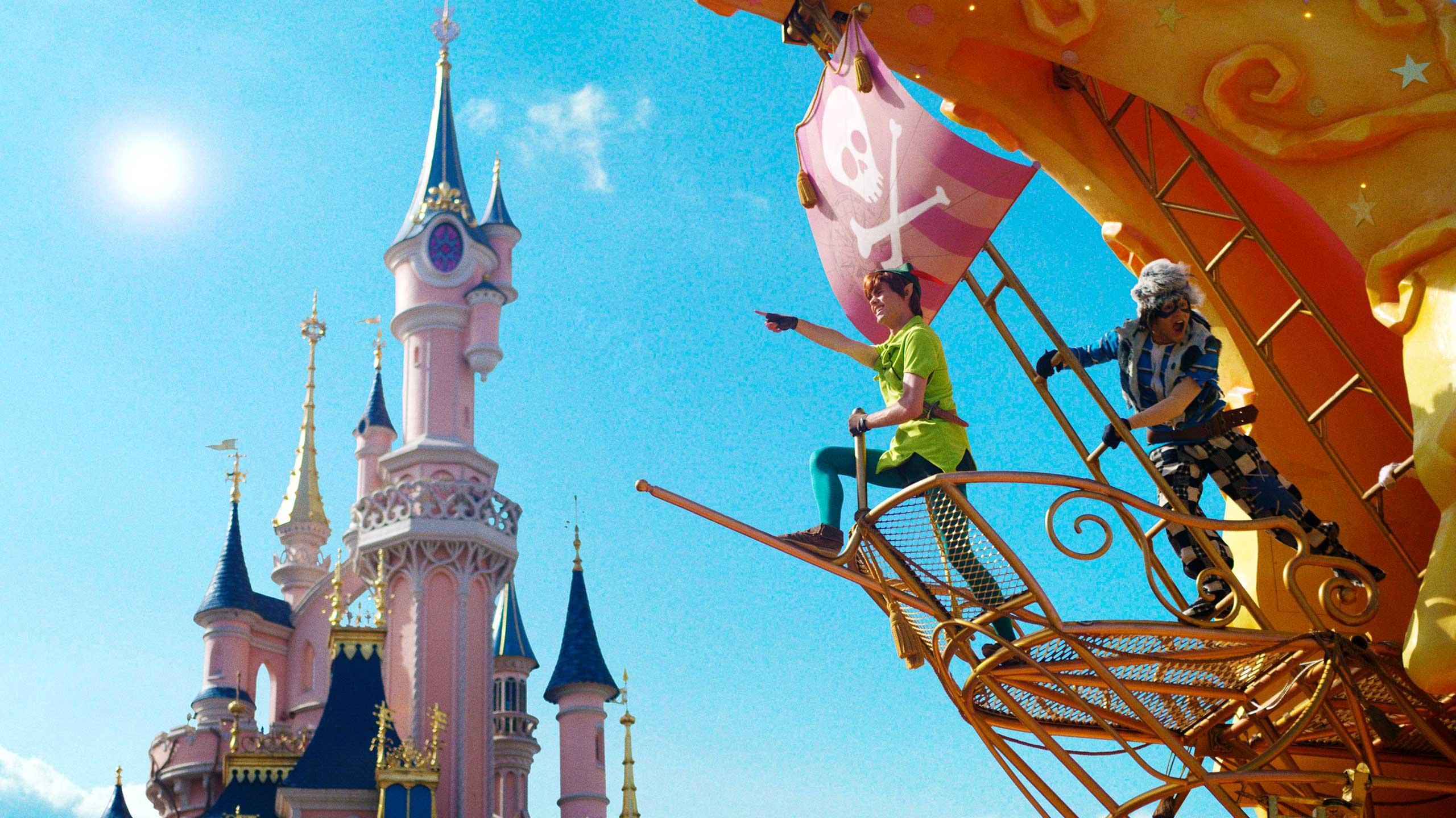 Un char coloré de la parade avec Peter Pan et un pirate en costume passe devant un château rose sous un ciel bleu vif, rendant votre séjour à Disneyland Paris vraiment magique.